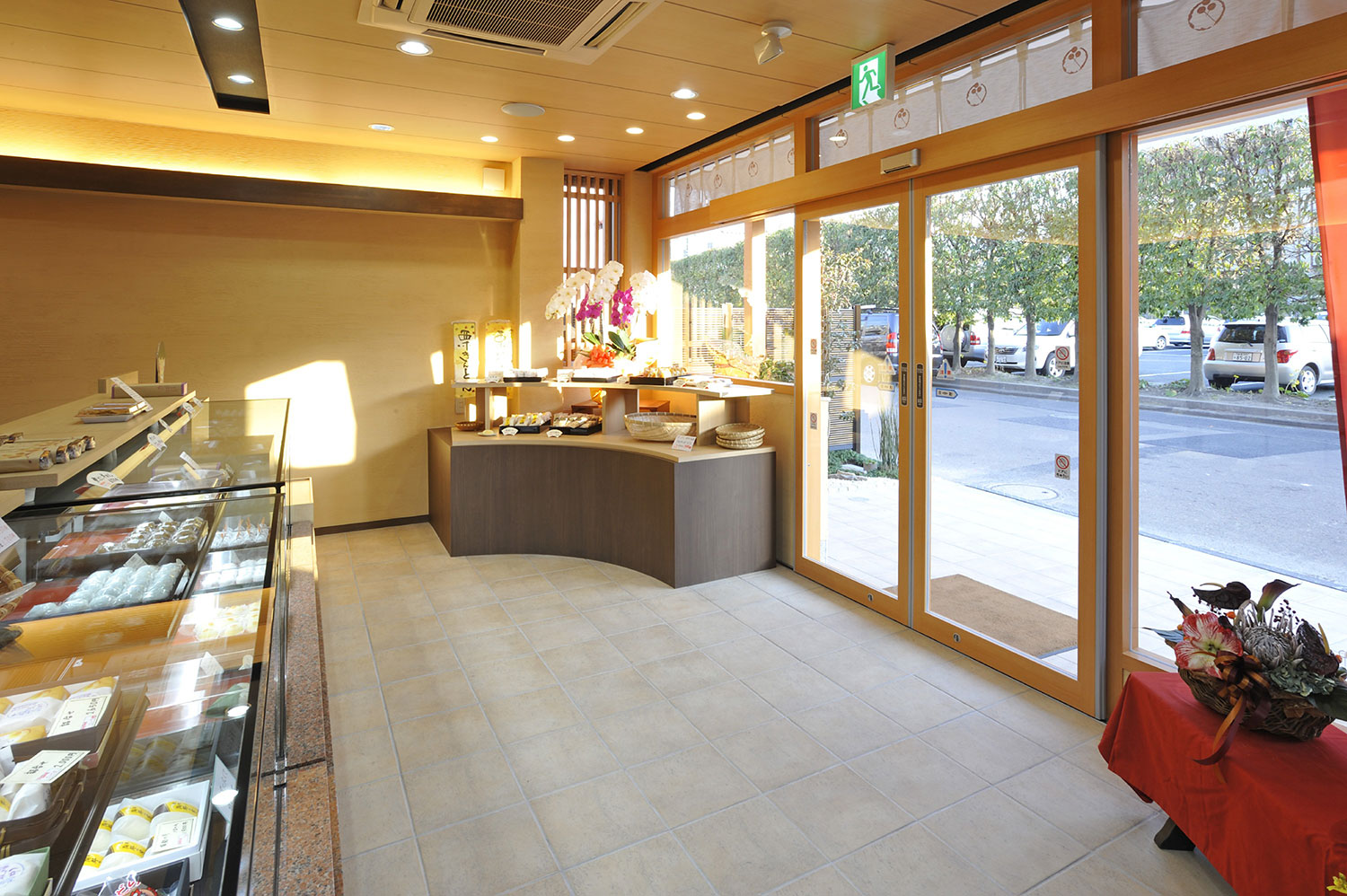 淡いオレンジと円柱にアーチを描いた入口部分で、お客様をお出迎え。店内は、吹抜けシャンデリア。奥には、間接照明をあしらい光の演出でおもてなし。喫茶スペースは落ち着いたくつろぎの空間をご提供します。
