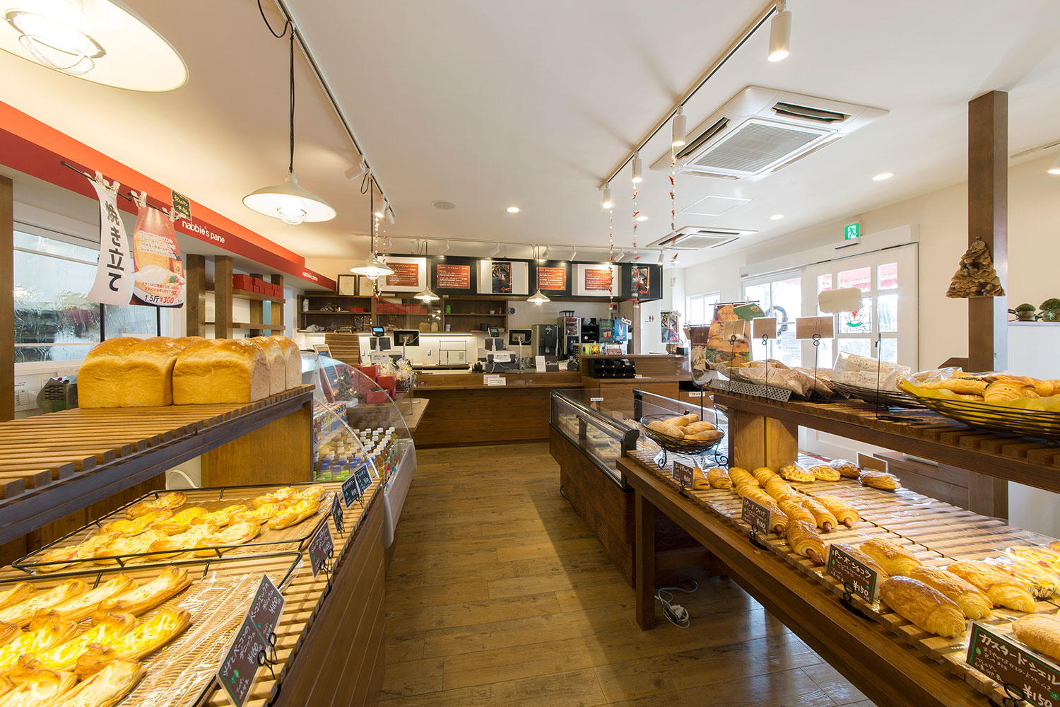 スケルトンを活かした空間デザイン。オーナーさん手作りの部分があったり、温かいナチュラルでやさしいパン屋さんです。